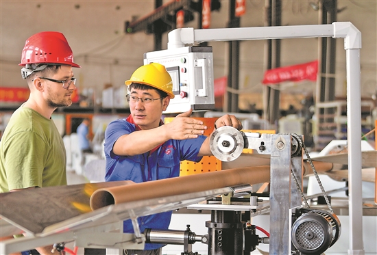 9月4日,在阜城縣碼頭鎮一家包裝機械制造企業生產車間,工人向外國客商介紹產品。