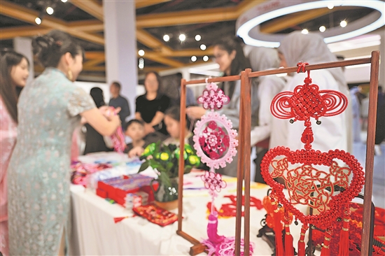 圖為人們在科威特艾哈邁迪省舉行的“天涯共此時·湘約中東”文藝演出活動前參觀中國傳統文化展臺。新華社發(阿薩德 攝)