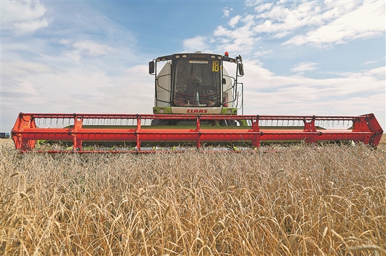 哈薩克斯坦北方多地9月進入春小麥收獲季節。據哈農業部消息,截至當地時間9月3日春小麥收獲面積已達300萬公頃。圖為近日,在哈薩克斯坦首都阿斯塔納附近的農田,聯合收割機收獲小麥。新華社發(奧斯帕諾夫 攝)