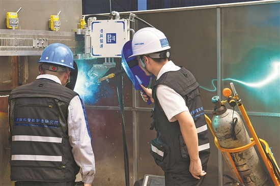 當日,10臺智能焊接機器人在深圳灣超級總部基地C塔項目建設現場正式投入使用。本次投用的柔性焊接機器人由中國建筑自行研發,承擔項目東塔10根直徑2.5米外框鋼柱、約7000噸鋼構件的現場焊接任務。新華社記者 梁旭 攝
