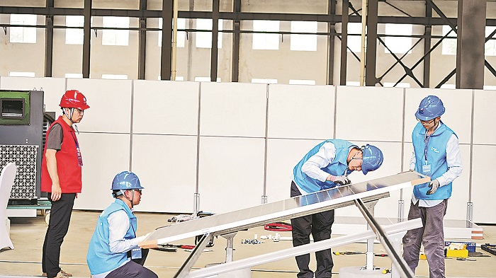 近日,浙江省光伏電站安裝運維職業技能競賽在浙江紹興新昌縣舉辦。本次技能競賽是全國首個集光伏電站安裝、調試、并網于一體的綜合性光伏職業技能競賽,浙江省內共11家單位參賽。此次競賽在檢驗參賽人員工匠精神和職業素養的同時,進一步推動了全省光伏產業的健康發展。圖為參賽隊伍同臺競技,各展風采。本報通訊員 張馨月 攝