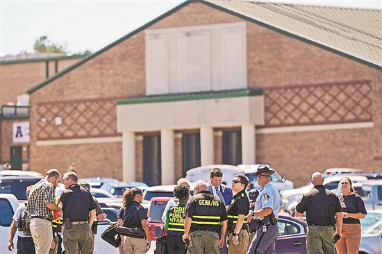 美國(guó)佐治亞州警方當(dāng)?shù)貢r(shí)間9月4日說(shuō),該州巴羅縣一所高中當(dāng)天上午發(fā)生槍擊事件,造成4人死亡、9人受傷。警方已逮捕一名嫌疑人,為該校一名14歲的學(xué)生。圖為4日,警察聚集在發(fā)生槍擊事件的阿巴拉契高中外。新華社/美聯(lián)