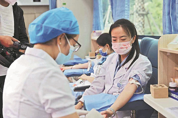 9月4日,在云南省第一人民醫院組織醫護人員無償獻血,解決臨床需求,這是醫院今年組織的第二次無償獻血。副院長宋正己介紹,每年用血緊張時,醫院工會都會組織醫護人員無償獻血。當天共有934名醫務人員成功獻血。本報記者 趙黎浩 攝