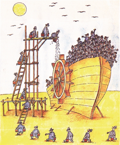 停在江心的大船瞬間擁上眾多游客,此時,正遇到天旱無水,航船不能起錨,好心的人們紛紛提桶運水沖擊駁輪,試圖行駛……