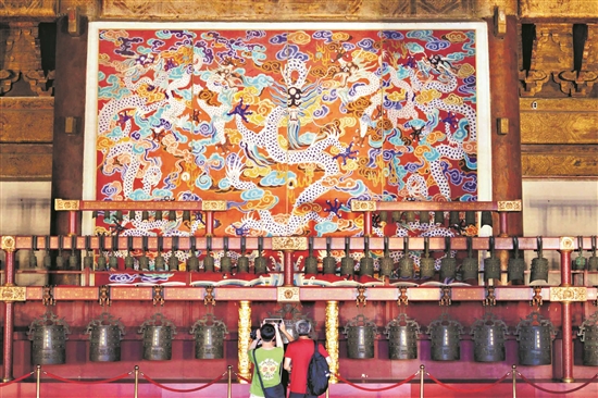 北京太廟享殿于近期恢復開放參觀,殿內68根大柱皆為整根金絲楠木,最高的達13.32米,直徑最大的達1.2米,殿頂用片金瀝粉彩畫裝飾,地面墁鋪金磚。殿內氣勢恢宏,在中軸線歷史建筑群體中極具代表性。