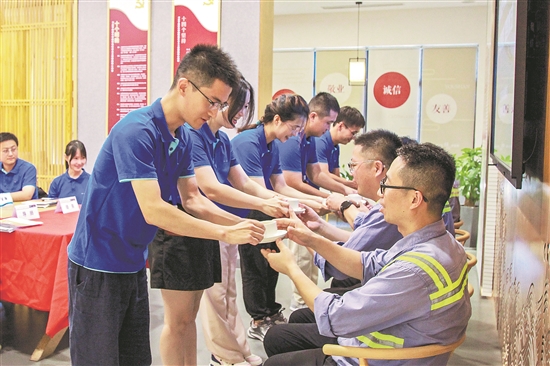 8月30日,浙江省寧波舟山港股份有限公司北侖礦石碼頭分公司舉行2024年新入職大學(xué)生“導(dǎo)師帶徒”培養(yǎng)計劃啟動儀式,12名新員工與結(jié)對導(dǎo)師簽訂師徒協(xié)議。圖為徒弟向?qū)熅床琛?/p>