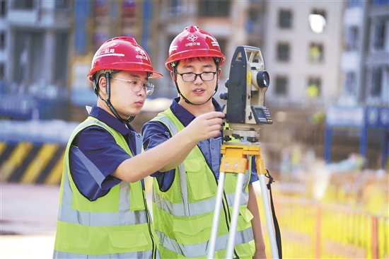 在中交二航局中交錦上項(xiàng)目工地上,工程師余訓(xùn)毅教導(dǎo)徒弟王英東,要利用好自己手中的全站儀,不僅精準(zhǔn)測量建筑物,也測好人生標(biāo)高,找準(zhǔn)發(fā)展定位。圖為王英東(左)在師傅余訓(xùn)毅的指導(dǎo)下檢測塔吊垂直度。方國俊 攝