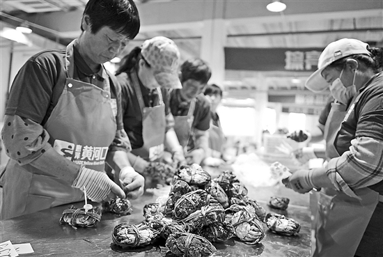 9月10日,山東省東營市墾利區(qū)的一處大閘蟹加工車間的工作人員對新鮮的大閘蟹進(jìn)行分選和捆扎。
