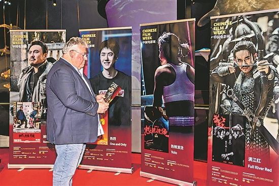 2024澳大利亞“中國(guó)電影周”開幕式近日在澳首都堪培拉舉行。圖為當(dāng)?shù)貢r(shí)間9月11日,在澳大利亞首都堪培拉,一名男子站在電影周影片海報(bào)前。