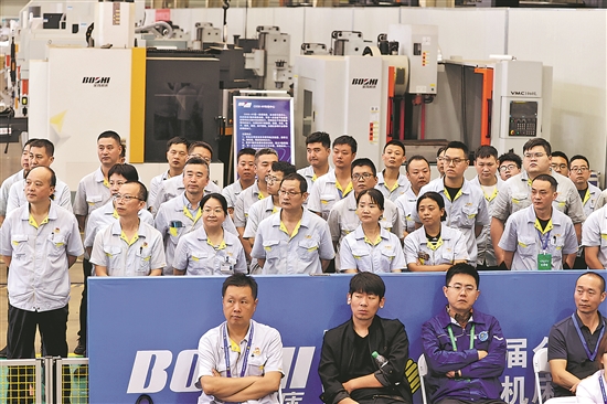 9月12日上午,在寶雞機床集團舉行的數控機床裝調維修工決賽實操考場,寶雞機床集團的員工現場觀摩比賽。