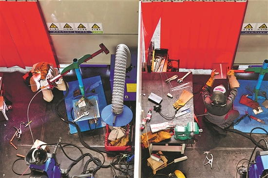 9月11日,第八屆職工職業技能大賽決賽的焊工賽項比賽現場,兩個在不同隔間的選手正在“隔空比拼”。