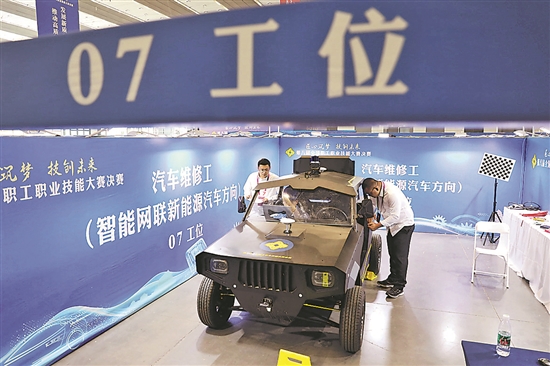 9月11日,汽車維修工(智能網聯新能源汽車方向)賽項比賽現場,選手對模擬仿真的無人駕駛新能源汽車進行調試、檢查。