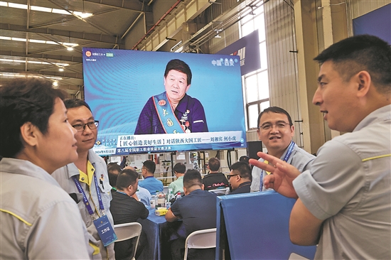 9月12日上午,在寶雞機床集團舉行的數控機床裝調維修工決賽實操考場,現場大屏幕實時直播“對話陜西大國工匠”節目。