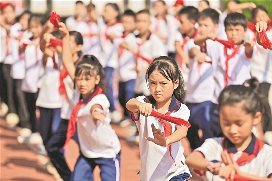 在梧州市長洲區龍平小學,學生們在陽光大課間進行武術練習(9月19日攝)。