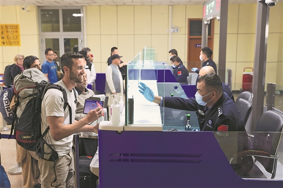 9月20日,在新疆紅其拉甫口岸聯(lián)檢大廳,新疆邊檢總站紅其拉甫邊檢站民警正在為入境旅客辦理入關(guān)手續(xù)。