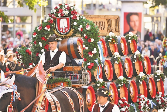 當地時間9月21日,第189屆慕尼黑啤酒節開幕。慕尼黑啤酒節始于1810年,已成為德國最著名的民俗節慶活動之一。這是當日拍攝的德國慕尼黑啤酒節開幕大游行現場。新華社記者 任鵬飛 攝