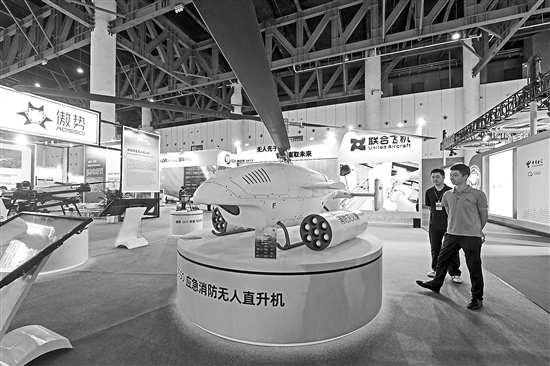 本次博覽會中,多家企業展示了低空經濟的一大批新技術、新產品、新場景,涵蓋物流、交通出行、通信保障等多個應用領域,描繪了未來低空經濟服務產業、社會發展的多種場景。圖為博覽會中的應急消防無人直升機。