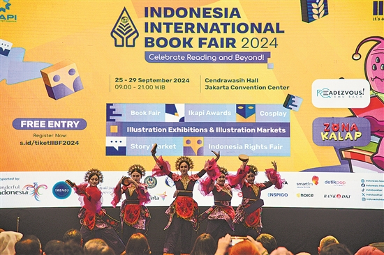 當(dāng)日,在印度尼西亞雅加達(dá)會展中心,舞者在印尼國際書展開幕式上跳舞。新華社記者 徐欽 攝