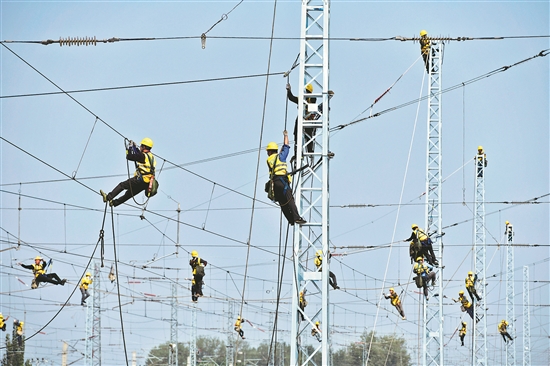 9月25日,在雄商高鐵山東省鄆城段,工人在鄆城站進(jìn)行接觸網(wǎng)軟橫跨安裝施工。