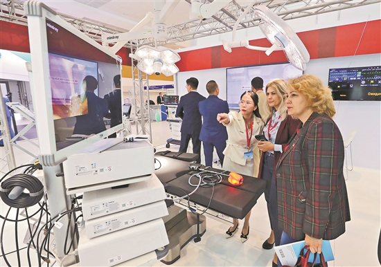 2024中國醫學裝備(白俄羅斯)展覽會近日在白俄羅斯中白工業園舉行,來自中國的30余家企業向白俄羅斯市場展示推介中國醫學裝備。圖為觀眾在展覽會上參觀。