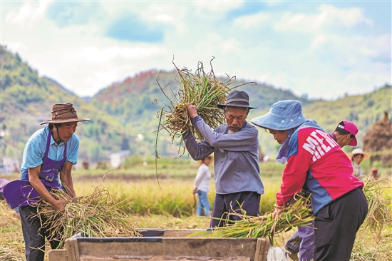 9月21日,貴州省黔西市鐘山鎮銅鼓村,農民趁晴好天氣搶收水稻,確保糧食顆粒歸倉。本報通訊員 范暉 攝