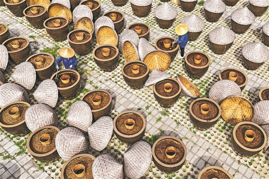 9月21日,山東省滕州市一家醬醋食品企業,工人利用晴好天氣澆淋曬制醬油,讓大缸里的醬料充分發酵。本報通訊員 張進剛 攝