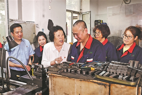 7月12日,遼寧沈陽,尉鳳英(左三)走進沈陽君威新能科技有限公司,在車間與一線車床工人交流。