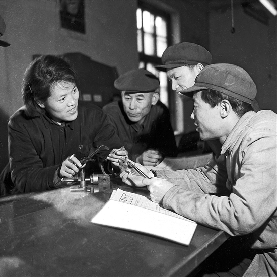 1964年3月,遼寧沈陽,尉鳳英(左一)和技術革新紅專大隊的工人一起在研究有色金屬冷擠壓加工的技術革新項目。工人日報 蔡壯田 攝