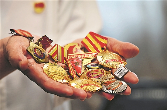 7月12日,遼寧沈陽,尉鳳英在家中捧著獎章講述過去的故事。