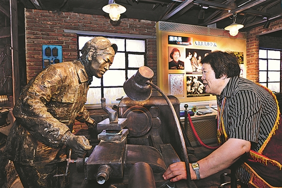 2016年6月16日,遼寧沈陽,沈陽勞動模范紀念館開館,尉鳳英在自己的雕像前憶當年。
