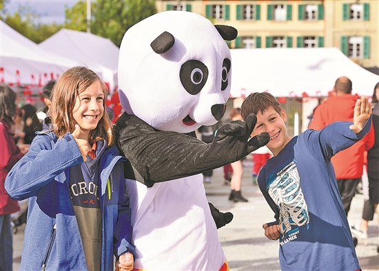 在瑞士伯爾尼“遇見(jiàn)中國(guó)”文化節(jié)上,孩子們與扮成大熊貓的工作人員合影。新華社記者 連漪 攝