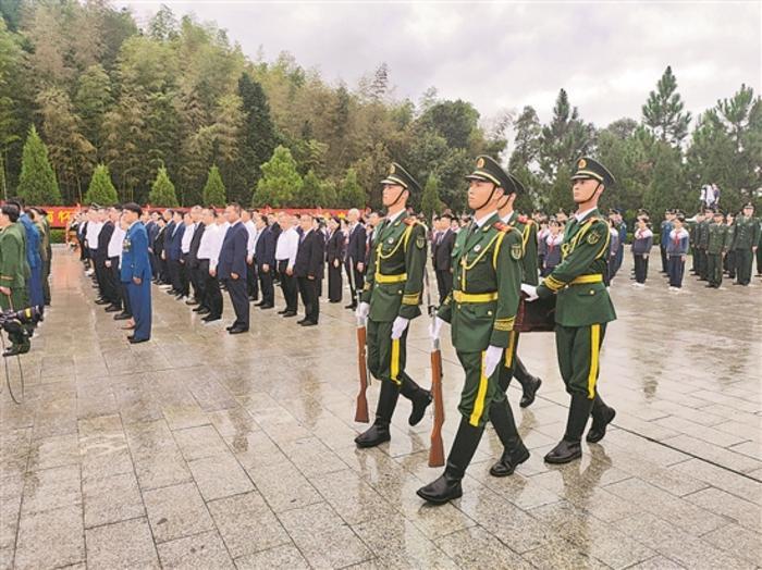 之后,《思念曲》再次低回奏響,兩名禮兵抬烈士棺槨禮步行進至烈士墓穴,將棺槨緩緩入土安葬,全場人員行注目禮。黃公略烈士安葬后,18名禮兵將9個花籃擺放至烈士墓碑前,在場人員依次獻花致敬,并瞻仰紀念墻。儀式結束后,禮兵將棺槨上覆蓋的國旗交給烈士家屬,以示尊崇和榮光。