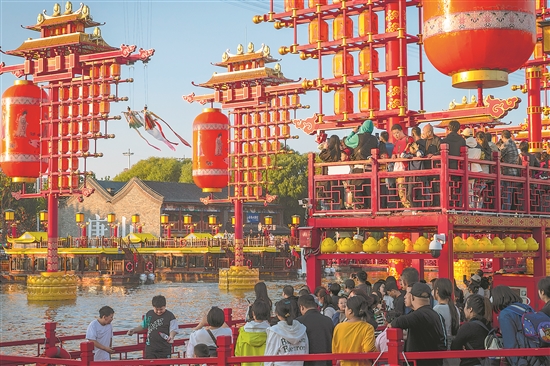 河頭老街是中國首個以運河文化為背景的唐風文化沉浸式旅游景區,截至10月4日,年內累計接待游客量已超過500萬人次,單日最高接待量達到11萬人以上,外地游客占比逾60%,真正實現了“因一景區而赴一城”的現象。本報記者 蔚可任 攝
