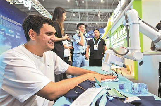 日前,在浙江杭州,外國觀眾體驗機器人艾灸。當日,在第三屆全球數字貿易博覽會現場,展出的中醫機器人吸引觀眾體驗。王剛 攝/中新社