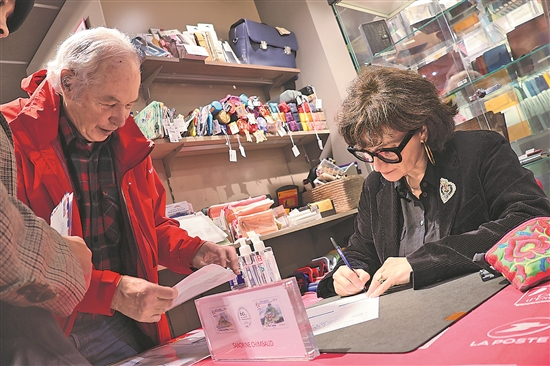 近日,在法國巴黎舉行的《中法建交六十周年》紀念郵票首發儀式現場,郵票設計者之一、法國藝術家桑德里娜·尚博為集郵愛好者簽名。新華社記者 張百慧 攝