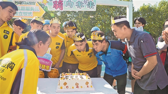 吹蠟燭、切蛋糕、發禮物……10月18日下午,在浙江省慈溪市總工會“累了么”騎手驛站滸山江站,一場集體生日會正在進行,“壽星”們都是10月過生日的外賣送餐員、快遞員。