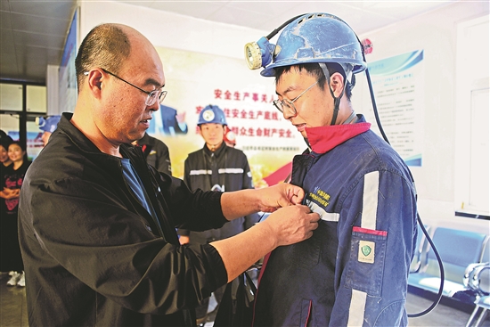 中國華能華亭煤業公司東峽煤礦近日以“家屬進礦區·親情囑安全”為主題開展了一場別開生面的家庭促安教育活動。通滅隊5名職工家屬代表應邀參加親情座談會,陪著他們的親人參加班前會、送親人下井,還親口品嘗班中餐,零距離體驗礦工生產生活環境。圖為在井口檢身室,通滅隊職工嚴琛的父親為他整理工裝,叮囑他注意安全。白銀寶 攝