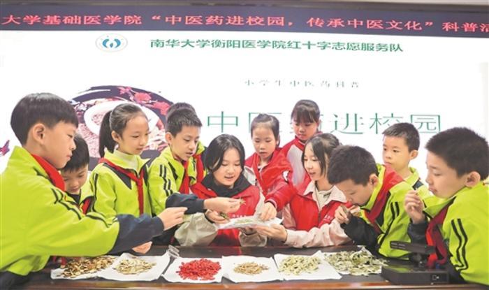 10月22日,在湖南省衡陽市蒸湘區(qū)實驗小學(xué),南華大學(xué)衡陽醫(yī)學(xué)院紅十字志愿服務(wù)隊的志愿者教小學(xué)生們辨識中藥材。