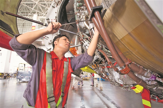 10月21日,在海南自貿港一站式飛機維修產業基地內,機務維修人員更換進境飛機發動機部件。