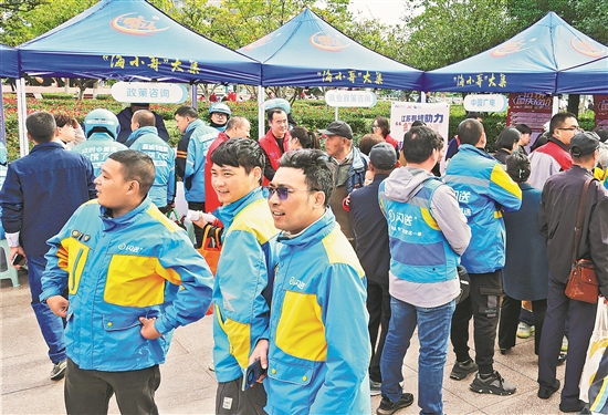 10月21日,江蘇省連云港市海州區市民廣場,新就業形態勞動者正在“小哥”大集上趕集。當日,海州區“紅韻·小哥”首場大集啟動,現場設置20個攤位,安全宣講、就業指導、法律援助、半價商品等27個服務項目亮相。