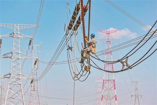 10月23日,在江蘇泰州鳳城至無錫梅里500千伏輸變電工程年度檢修現場,江蘇省送變電有限公司檢修人員正在對跳線懸垂合成絕緣子串進行更換,保障電網安全穩定運行。據悉,該工程是我國規模最大的超高壓跨越長江輸變電工程,自投運以來,已累計送電超175億千瓦時。本報記者 王偉 本報通訊員 史俊 攝