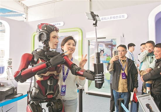 圖為在第七屆世界聲博會上,一款人形交互機器人持自拍桿與觀眾合影。新華社記者 傅天 攝