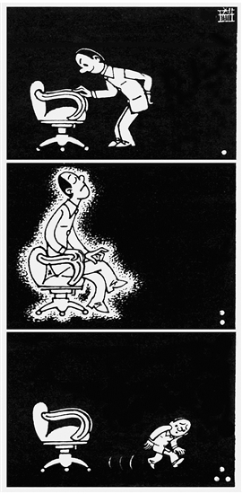 再后來(lái),劉局的膽子也變大了,他做了一些當(dāng)初“大劉”想都不敢想的事情。可以想象的是,劉局離開(kāi)了那把提升自己膽量的座椅。就在劉局屁股離開(kāi)座位那一瞬間,他的身段以迅雷不及掩耳之勢(shì)降了下來(lái),這又是誰(shuí)?偉岸高大的劉局,被低矮到幾近令人忽視的“老劉”取代。現(xiàn)在再看劉某,身姿竟然連當(dāng)年的大劉都不及了。此刻的心情,心理脆弱一些的旁觀者都不忍心描述。