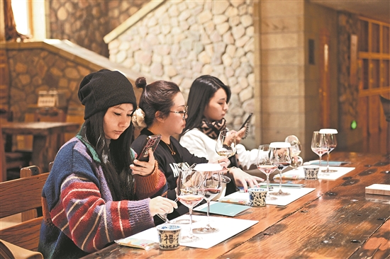 10月23日,游客在位于寧夏回族自治區銀川市的志輝源石酒莊品酒。深秋時節,位于寧夏賀蘭山東麓的多家酒莊彩葉繽紛、秋色宜人,吸引不少游客前來參觀品酒。