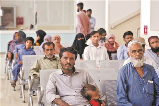 圖為近日在巴基斯坦西南部俾路支省瓜達(dá)爾,當(dāng)?shù)孛癖娫谥邪陀颜x醫(yī)院的門(mén)診大廳候診。新華社發(fā)(艾哈邁德·卡邁勒 攝)