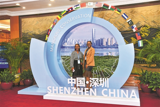 11月6日,兩位嘉賓在會場外合影留念。當日,國際紅樹林中心成立協定在深圳正式簽署,首批18個成員國代表共同簽署協定并為國際紅樹林中心揭牌。