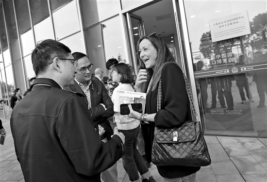 11月4日,來自意大利的參展商(右)在國展中心境外人員服務站外與工作人員交談。