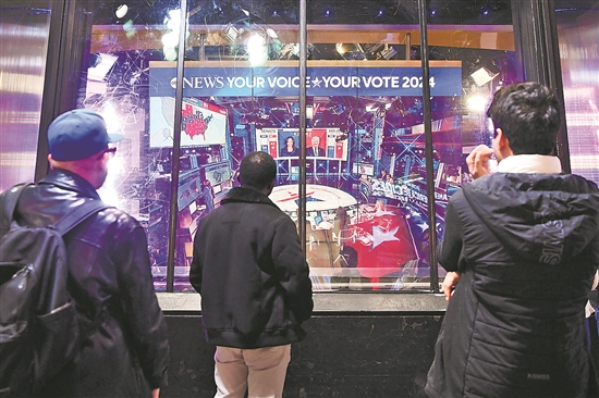 北京時間11月6日,人們在美國紐約時報廣場觀看實時出口民調(diào)。美國媒體測算,共和黨總統(tǒng)候選人特朗普已獲得至少270張選舉人票。 新華社記者 李睿 攝