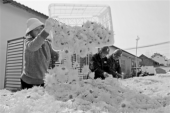 11月6日,河南省許昌市鄢陵縣張橋鎮裴莊村村民在采收金絲皇菊。