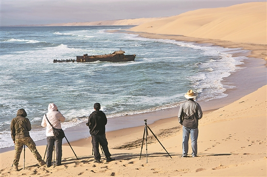 納米布-諾克盧福國家公園位于納米比亞西南部的大西洋沿岸,擁有多個知名景點,深受游客喜愛。這是近日在納米比亞納米布-諾克盧福國家公園內的一處船只殘骸景點,游客拍照留念。 新華社記者 陳誠 攝